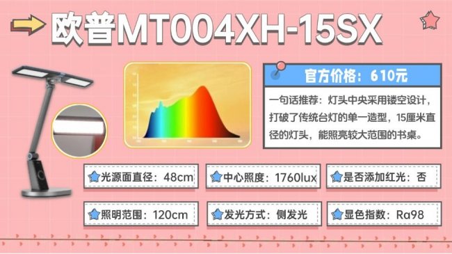 2026年小孩护眼灯怎么选之抄作业欧普MT004XH-15SX儿童护眼灯推荐:采用48cm双翼灯头搭配侧发光设计,光线可以均匀铺满约160cm桌面,避免亮度集中或刺眼。它的灯头可多角度翻转,配合阻尼转轴,上下左右自由调节光照方向,适应不同坐姿和桌面高度。此外功能方面支持入座感应、智能调光、多档亮度与场景模式切换,并带定时休息提醒,操作便利。缺点是光环境传感器在夜间容易被外界干扰误触,可能突然亮灯。