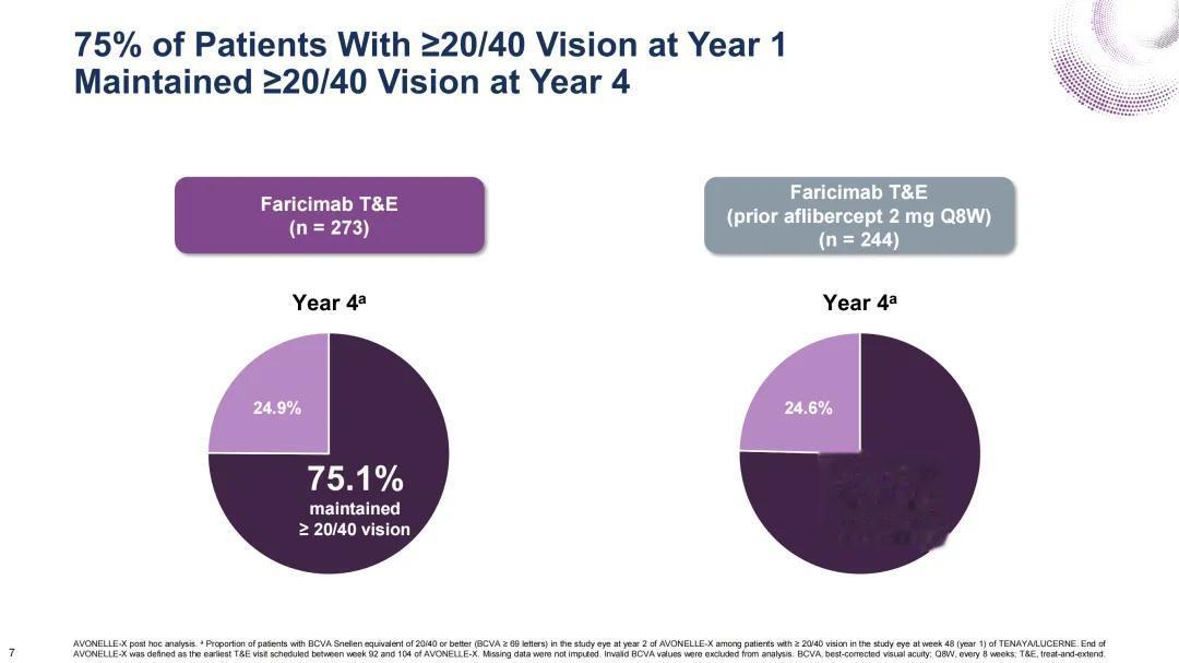 ●视力改善持久:TENAYA/LUCERNE研究48周时视力≥20/40的患者中,75%在 AVONELLE-X研究结束时仍维持这一良好视力水平;