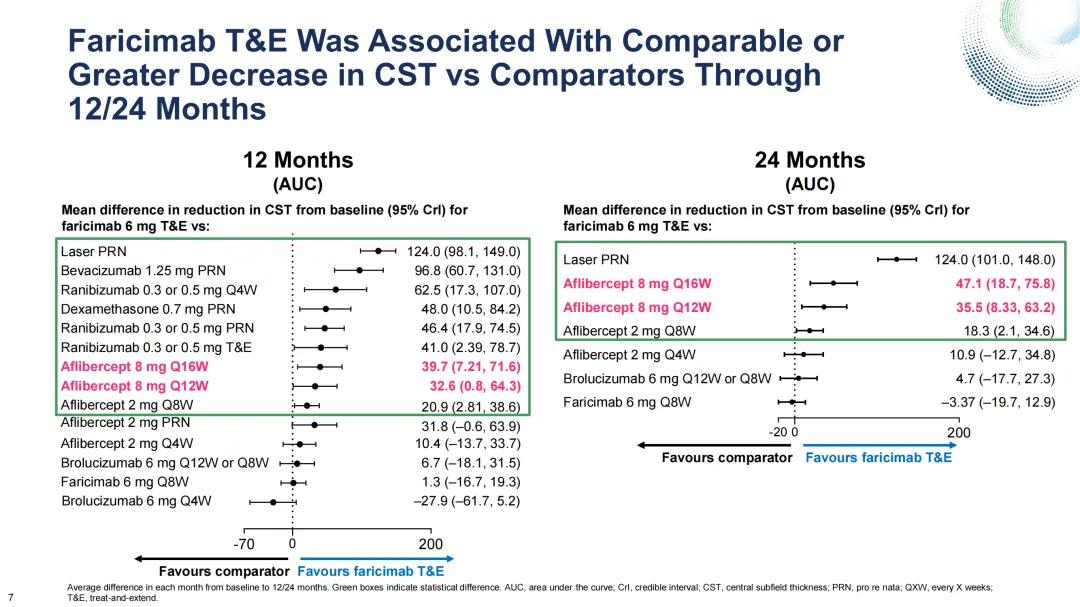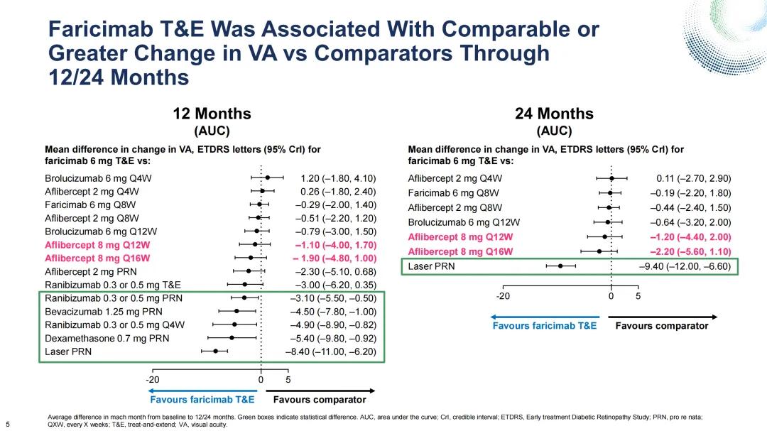 既往有网络荟萃分析(NMA)探讨了法瑞西单抗相比阿柏西普等单通路抗VEGF药物治疗DME12个月的疗效,本次大会则披露了长至1-2年疗效比较结果: