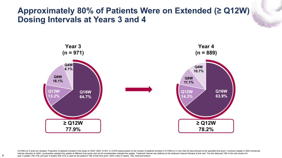 ●治疗间隔优势显著:AVONELLE-X 研究结束时,78.2%的患者实现≥12周给药间隔,63.9%的患者更是达到每4个月给药一次,超过50%的患者在第3年和第4年时满足潜在每20周给药标准;
