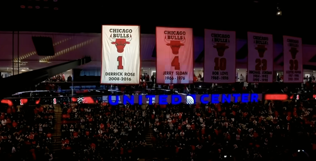 联合中心球馆上方的横幅缓缓揭开,一件红色的1号公牛球衣静静悬挂,它旁边是乔丹的23号和皮蓬的33号。