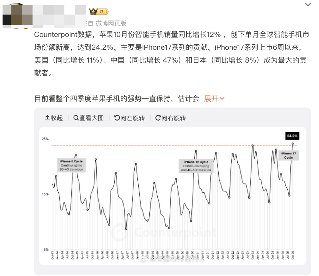今年iPhone 17系列,特别是标准版,仅用了两个多月时间就达成了激活量突破1000万台的恐怖成绩,要知道华为Mate 60系列整个生命周期的销量也就1000多万台——其他几个品牌全部旗舰手机的全生命周期销量相加,可能都只能刚刚摸到1000万台。