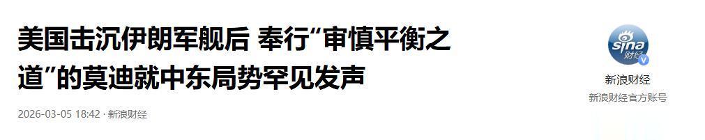 信息来源:美国击沉伊朗军舰后 奉行“审慎平衡之道”的莫迪就中东局势罕见发声 2026-03-05 18:42·新浪财经