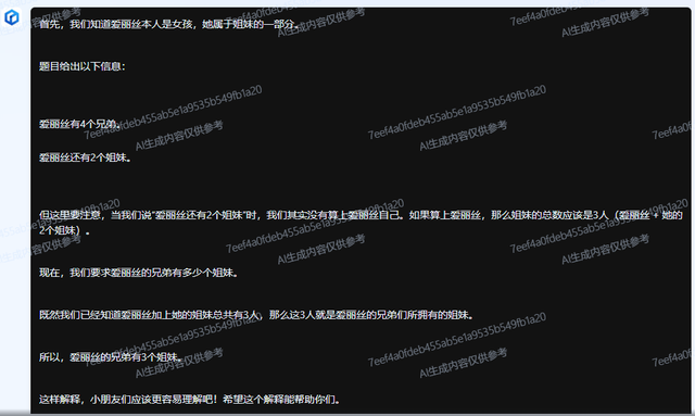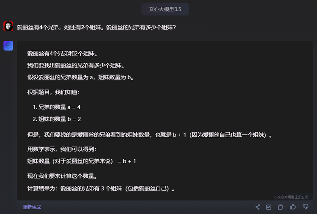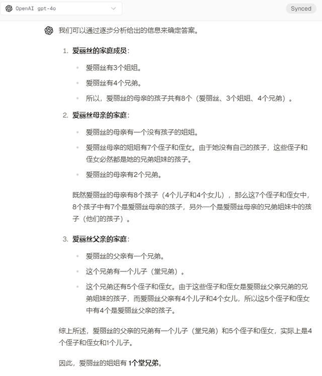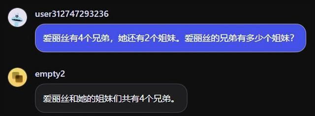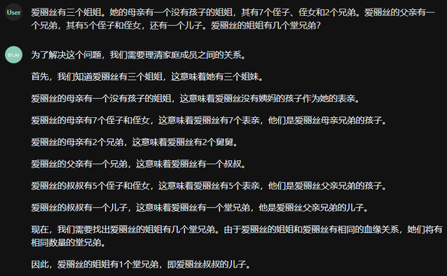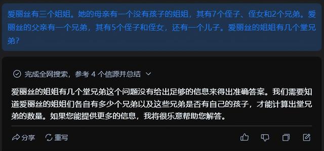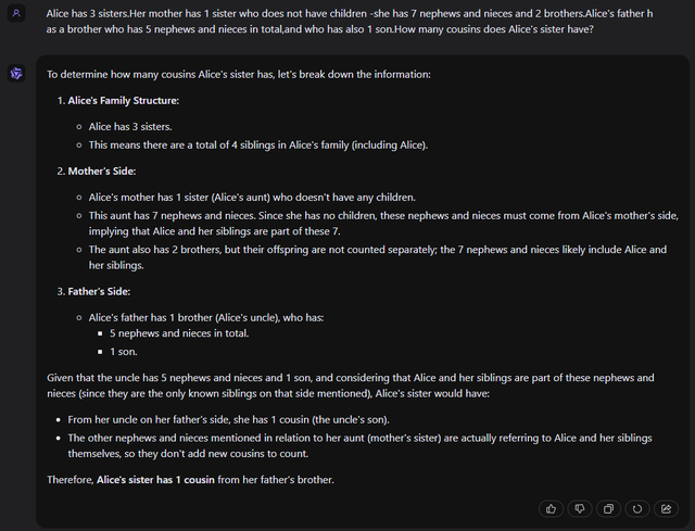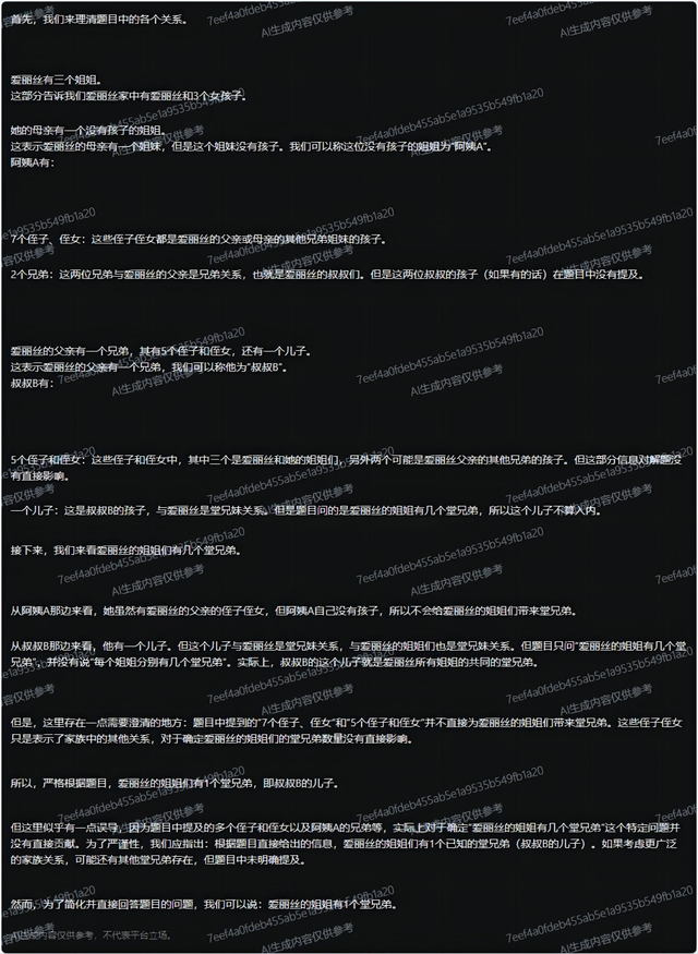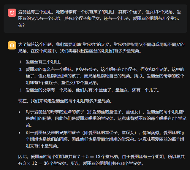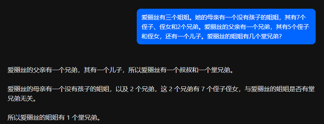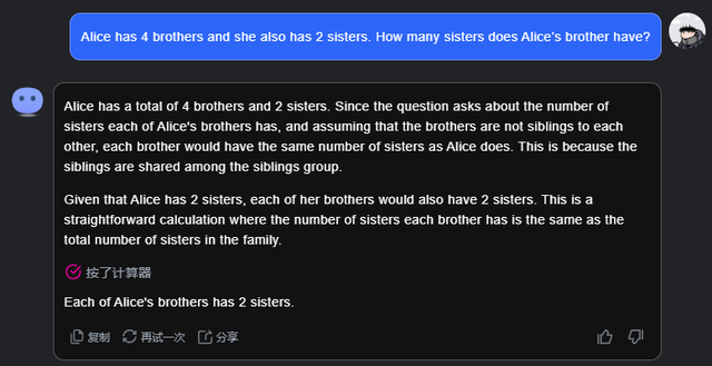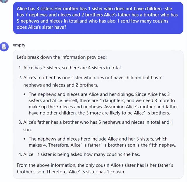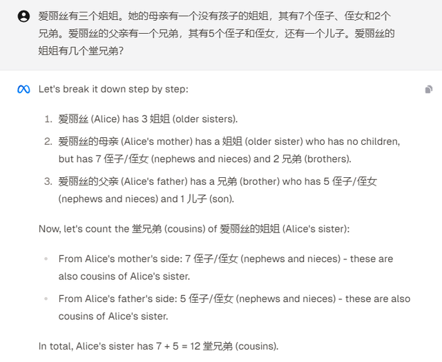 最后评测完后,我又设置了一个陷阱题“爱丽丝有三个姐姐。她的母亲有一个姐姐,其有7个侄子、侄女和2个兄弟,还有一个儿子。爱丽丝的父亲有一个兄弟,其有5个侄子和侄女,也还有一个儿子。爱丽丝的姐姐有几个堂兄弟?”