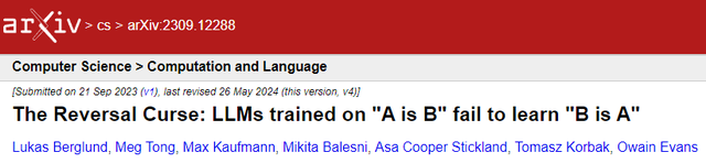 但是基础的爱丽丝有姐妹,爱丽丝也是她兄弟的姐妹,它解不了。这就是典型的泛化失败,类似有篇论文说的逆转魔咒——接受过“A 是 B”训练的大语言模型无法学会“B 是 A”。