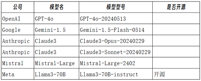 介绍一下本次参赛选手。首先是国际上顶流的5个SOTA大语言模型,其中一个开源,四个闭源。王者GPT-4o肯定有,然后是谷歌的Gemini1.5-Flash、Claude3-Opus、Mistral-Large,最后一个是开源的Llama3-70B。