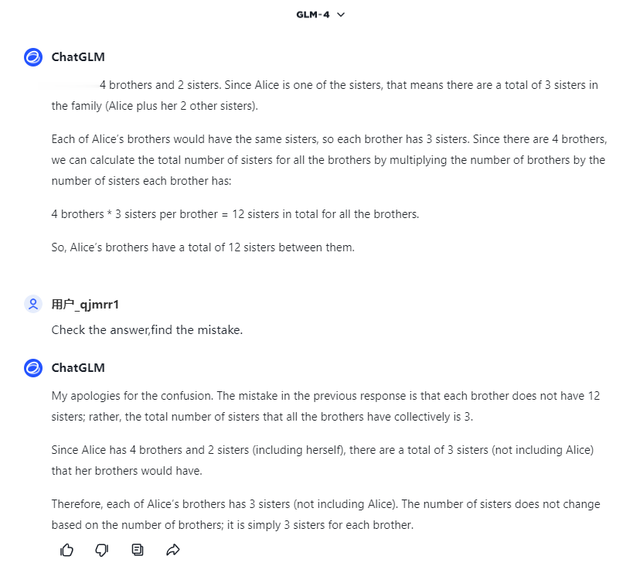 个别模型在错误回答后,提示它反思一下“Check th answer,find the mistake”,它能回答正确,像智谱GLM-4这样,虽然推理还是有问题。