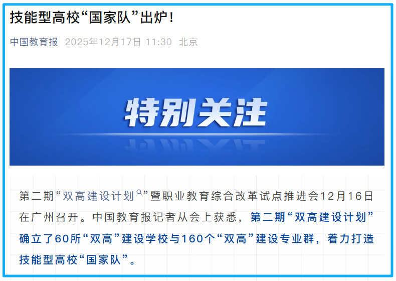 新易学小编从《中国教育报》获悉,第二期“双高建设计划"暨职业教育综合改革试点推进会在广州召开会议,推进实施第二期“双高建设计划”,确立60所“双高”建设学校与160个“双高”建设专业群,着力打造技能型高校“国家队”,为强国建设、民族复兴筑牢高技能人才培养示范高地。