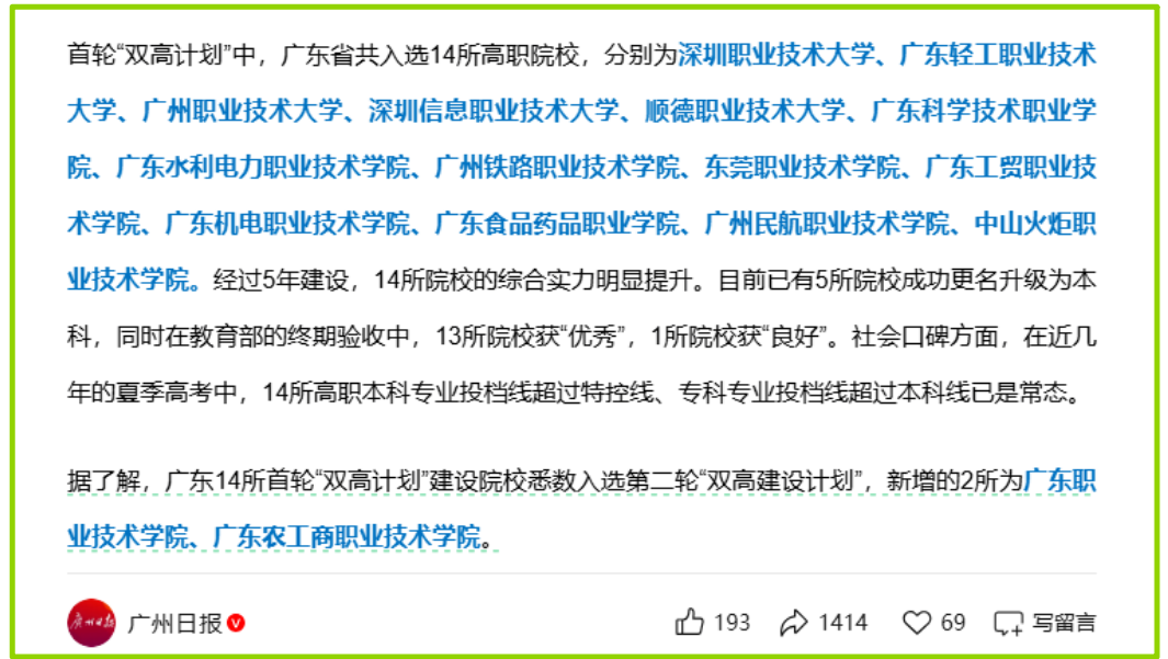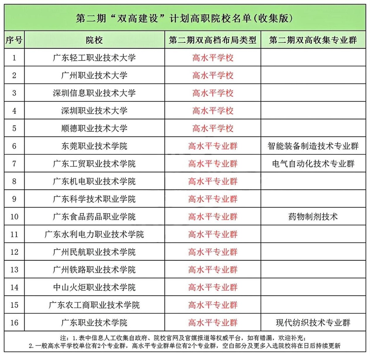 值得关注的是,广东省实现了“零淘汰”,即首轮入选院校全部通过考核、进入第二期,体现出这些地区在“双高计划”建设过程中的持续稳定性。除首期14所院校全部晋级外,还新增了广东职业技术学院、广东农工商职业技术学院。