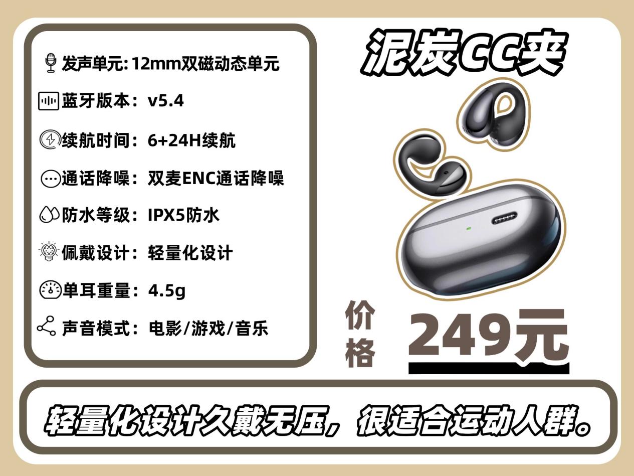 本款泥炭CC夹单只重量仅5.85g,采用人体工学轻量化夹耳式设计,配合亲肤硅胶耳垫,实现久戴无压、跑步不掉的稳固佩戴体验。搭载12mm 双磁超动态单元,低音浑厚饱满,中高频清晰通透,音质表现均衡耐听。同时支持Bluetoothv5.4协议,连接稳定且延迟低,具备IPX5级防水能力,应对日常汗水和小雨无压力,综合续航可达6+24小时,搭载定向传音技术保护你的隐私安全,同时支持了双设备的连接,具有电影、游戏、音乐模式可切换,十分便捷。
