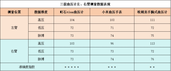 测评方法:通过测量不同位置(左臂、右臂),然后对比高压、低压、脉搏数值结果。