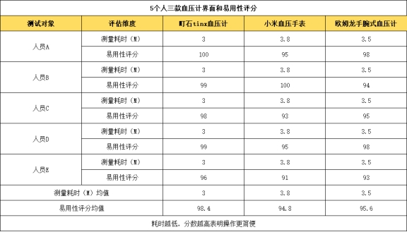 测评方法:找了5个人来测量,记录每个人每款设备从启动到测量完成所耗费的时间,并让每个人对每款设备的易用性进行打分。