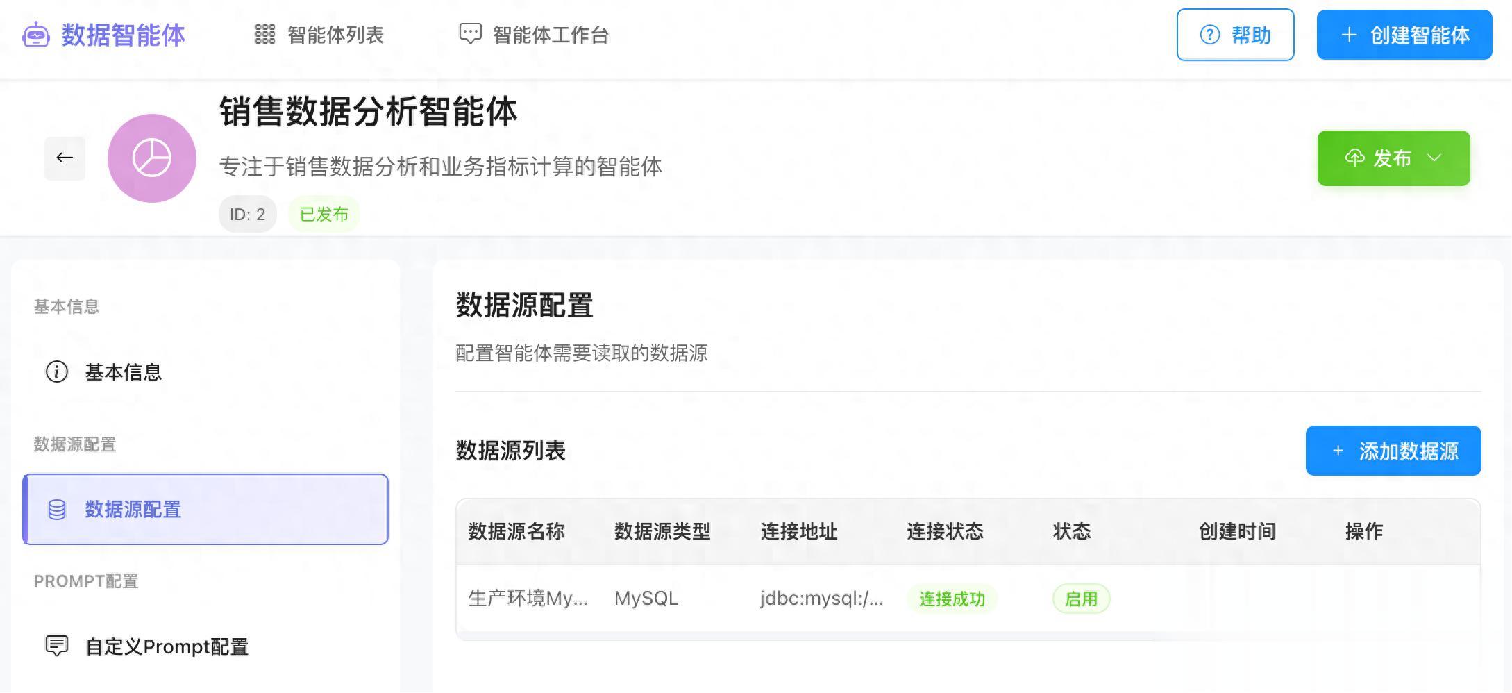 之前配置的datasource是NL2SQL系统的管理数据库,负责存储系统配置和元数据,而真正的查询目标数据库是通过智能体动态配置的。