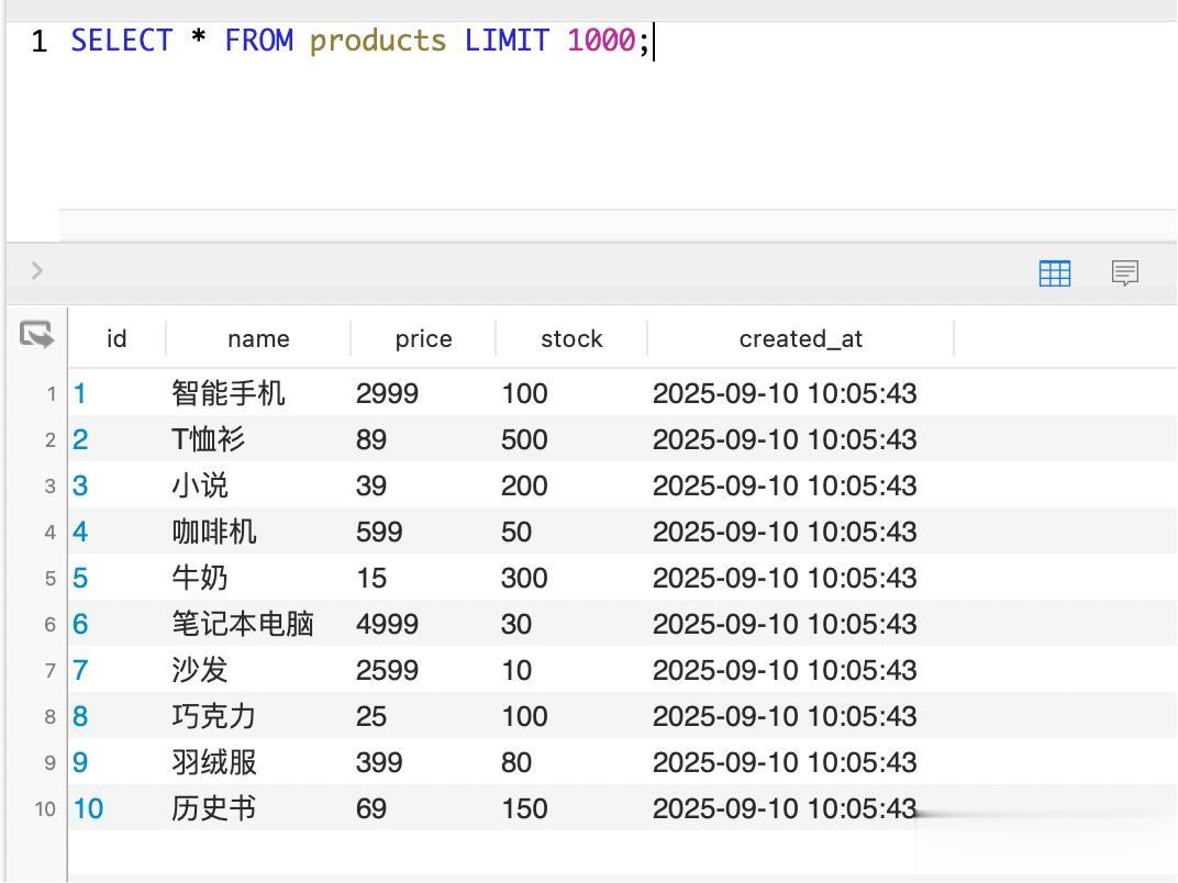 商品数据 (products) 插入了10个商品,价格从15元的牛奶到4999元的笔记本电脑,库存数量也各不相同,模拟真实的商品库存情况。