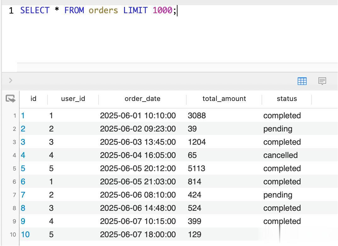 订单数据 (orders) 创建了10个订单,分布在2025年6月的不同时间,包含三种状态: