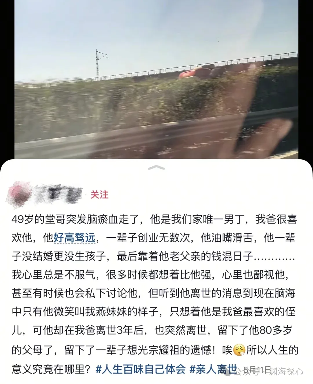 最近,网上有一篇帖子很火,讲的是作者49岁的堂哥突发脑淤血,走了。在作者笔下,堂哥是个“失败者”:好高骛远、油嘴滑舌、一