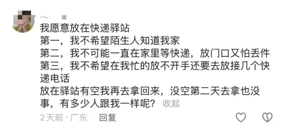 但也有人觉得放驿站挺好。理由也很实在,白天上班不在家,快递员送来也收不到,不如下班路过驿站顺手取一下。