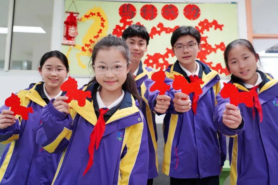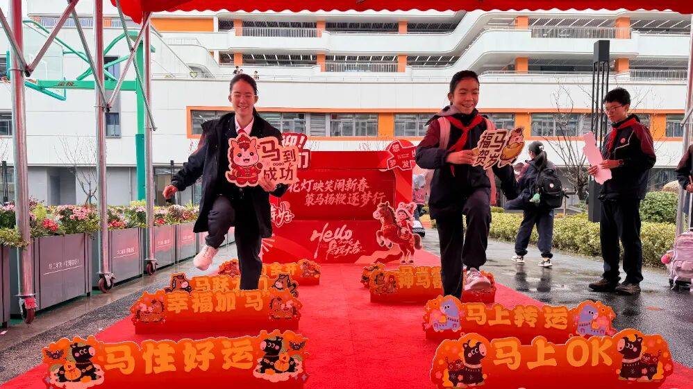 华东师范大学第二附属中学前滩学校老师手持祝福牌在校门口传递期许,学生们在马年主题装置间活力奔跑,洋溢蓬勃朝气。