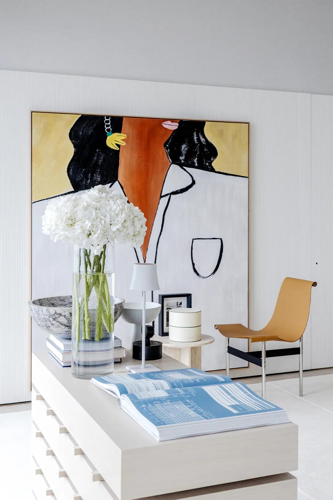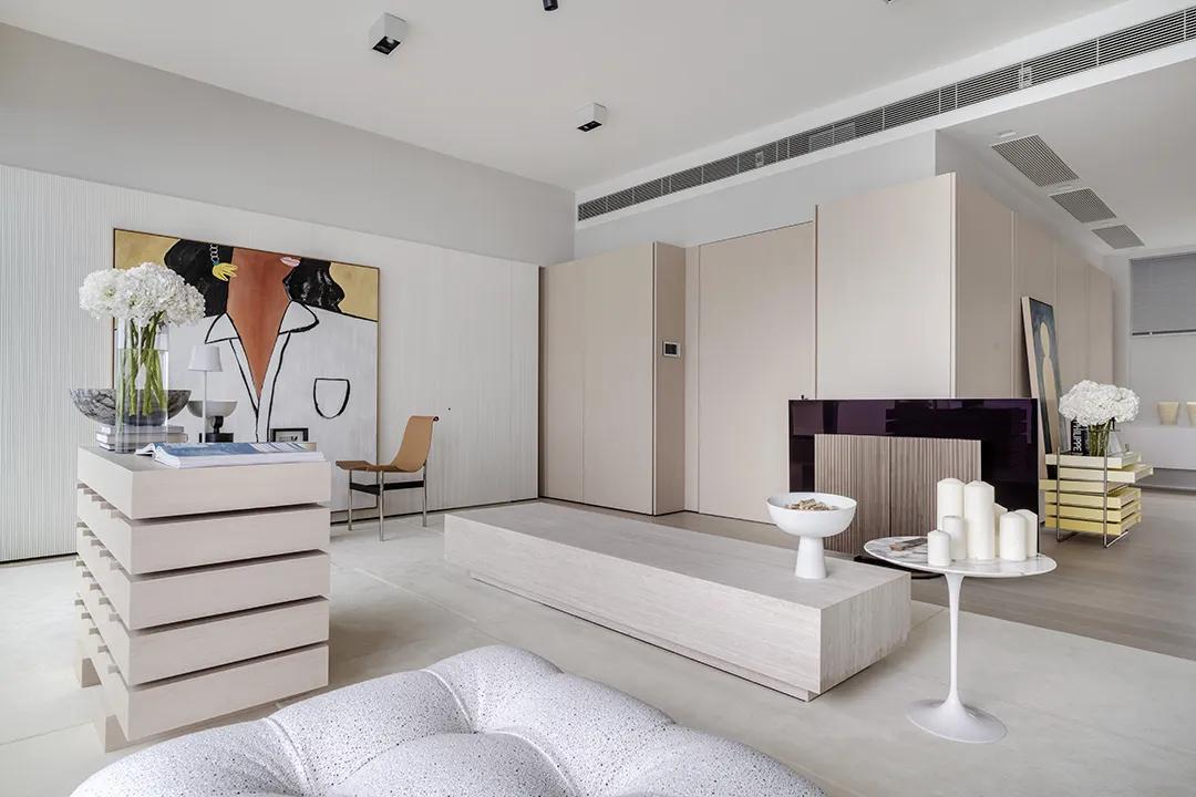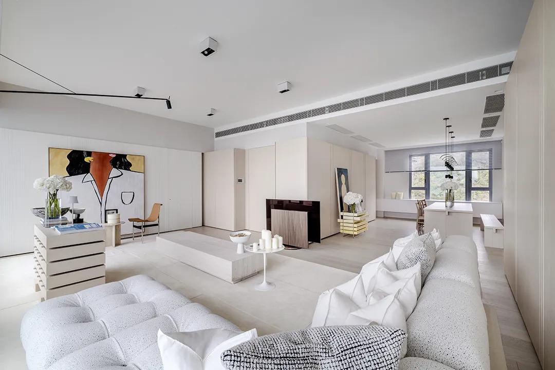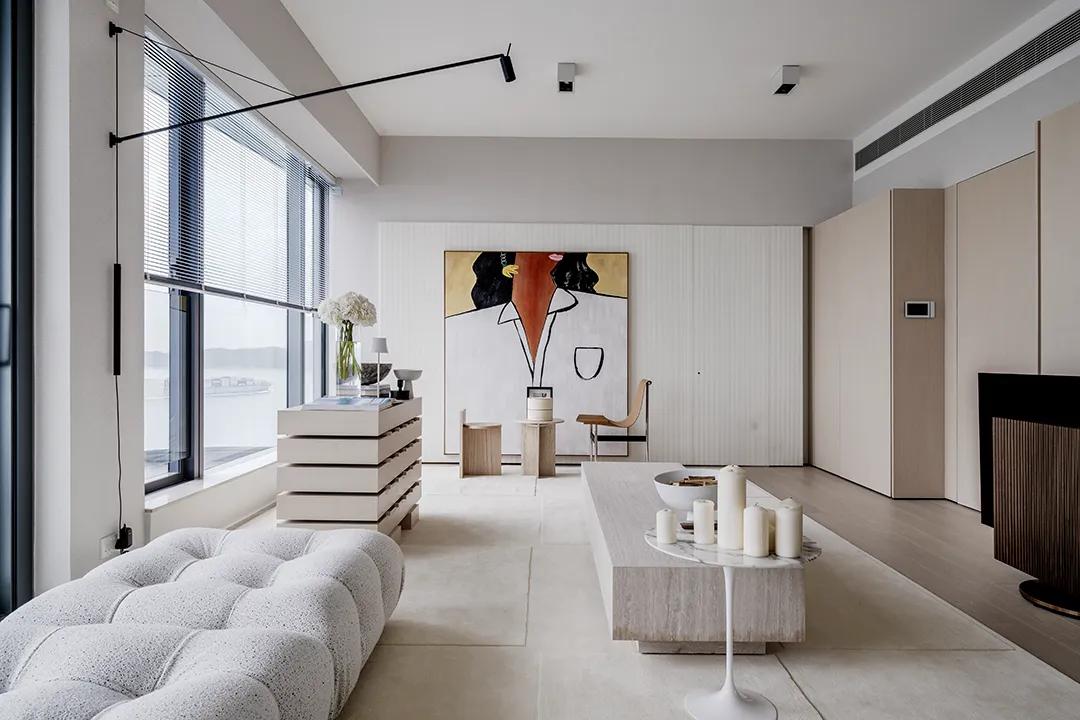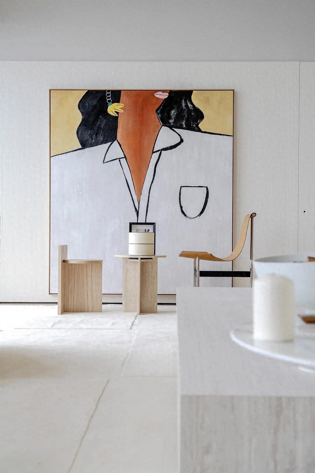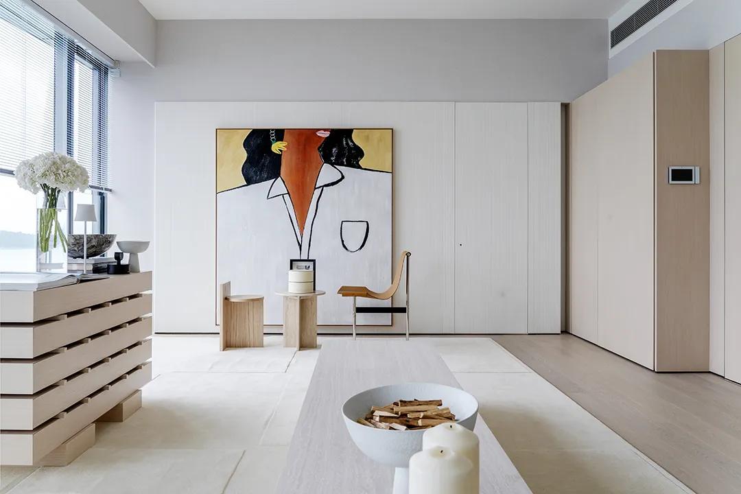 The viewing balcony on one side of the living room introduces soft side light, making the daytime light more uniform and natural, reducing the dependence on lamps and shaping the space atmosphere with light. The large art painting on the wall becomes the visual focus, forming a contrast and balance with the plain island platform. Art is no longer an ornament, but a part of daily life.
