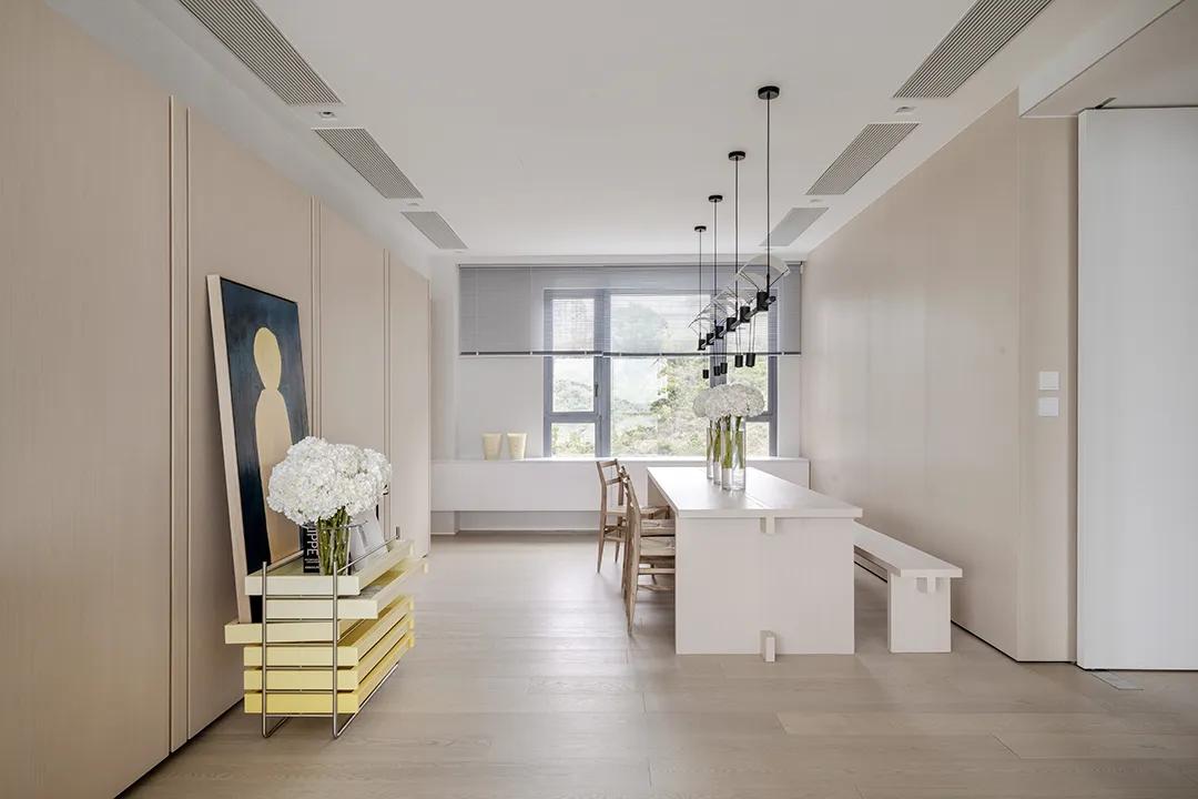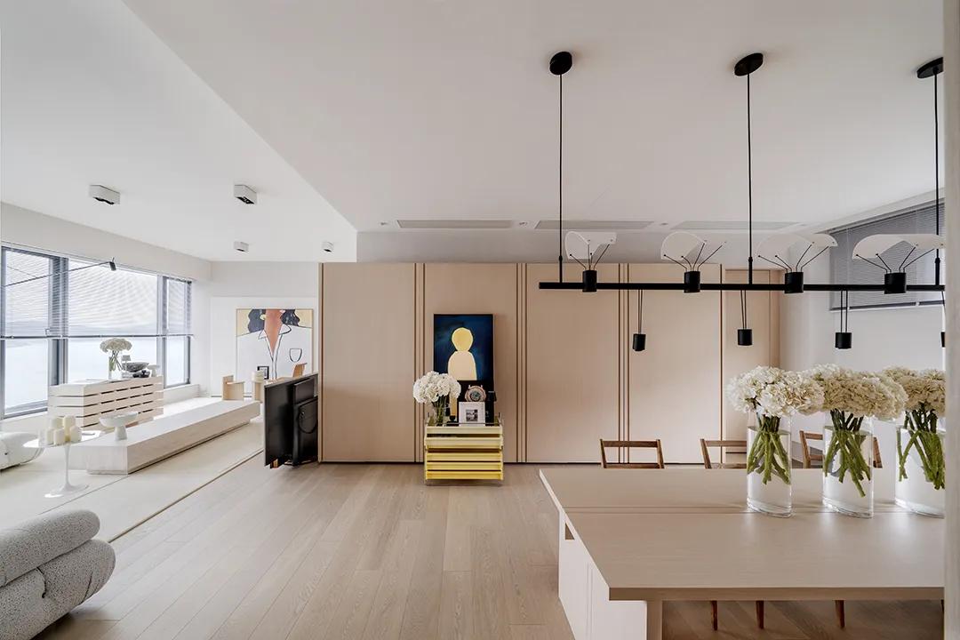 The dining and kitchen area is wrapped in warm wood, with a soft touch and a warm atmosphere. Light-colored flower arrangements are dotted in it to break the monotony. The rattan dining chairs bring a lazy and relaxed temperament, enrich the texture layers, and make the dining area more open and socially dynamic.