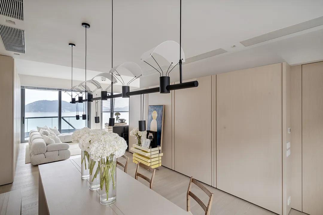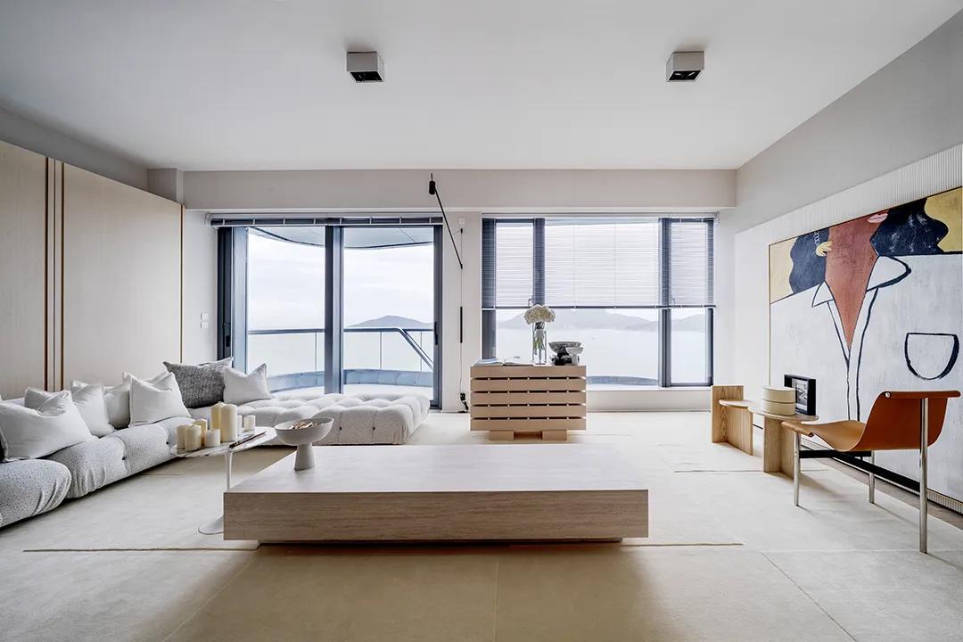The living room is paved with original wood floors, and the white walls and ceiling form a clean and bright background. Deliberate blank space is left visually to allow furniture and soft furnishings to present themselves freely. The extra-large bay window connects the interior with the sea view, making the natural scenery part of the space, extending the lighting and vision infinitely, and making the public area more spacious and grand.
