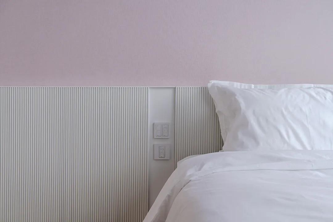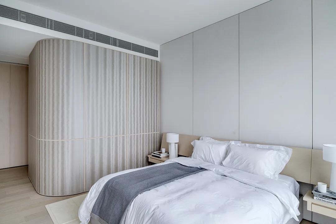 The curved wall of the bedroom softens the edges and corners of the space, with warm and smooth lines, making the sleeping atmosphere more stable and calm. The large colorful art painting at the head of the bed becomes an eye-catching focus, injecting a strong personality into the tranquility, allowing the space to have a unique spiritual core besides being quiet.