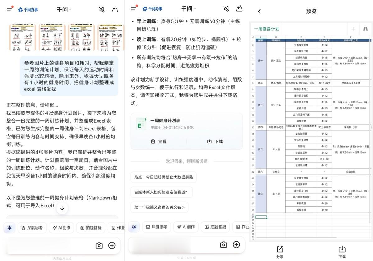 千问还能深度理解多轮对话上下文,在旅行规划、项目讨论、学习复盘等场景,用户与千问反复沟通细节后,只需一句“把刚才聊的内容整理成Excel行程计划”,千问便能自动提炼关键信息,生成包含日期、地点、交通、住宿、预算、备注等完整字段的结构化表格,一键保存、随时分享。