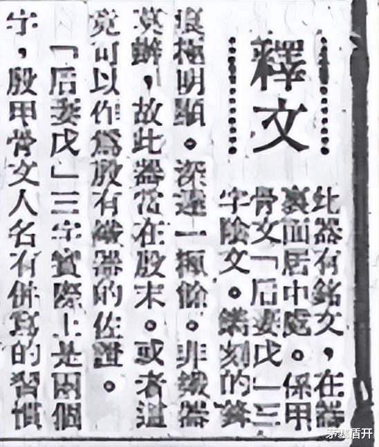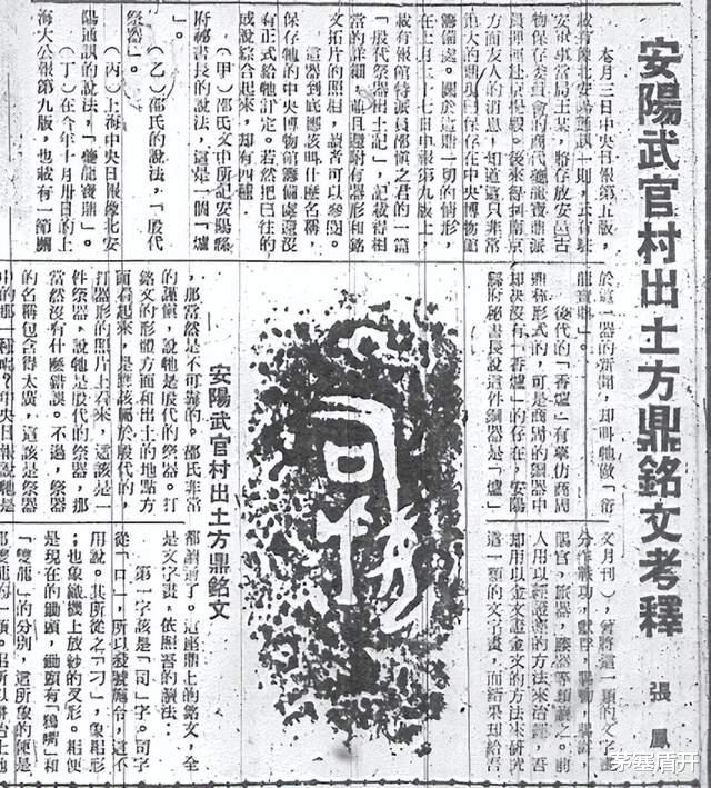 不久之后的1946年11月17日,当时的报纸媒体“《中央日报》”发表了一位名叫张凤的作者创作的文章《安阳武官村出土方鼎名称考释》。