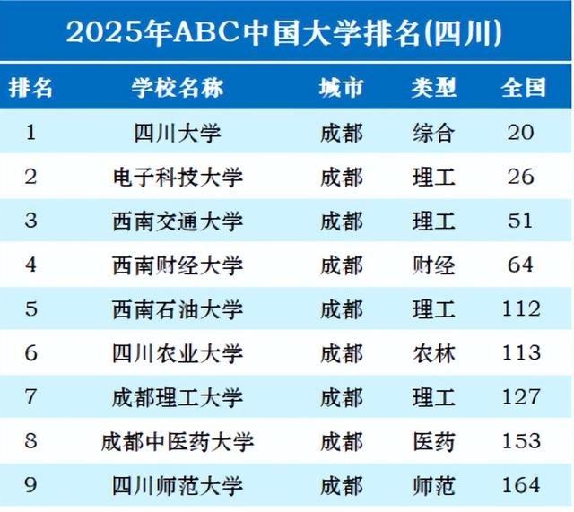 四川高校的“天花板”之争:川大稳坐C位,双一流院校还有哪些“黑马”?提到四川,大家通常会想到熊猫、火锅、九寨沟,但如果你