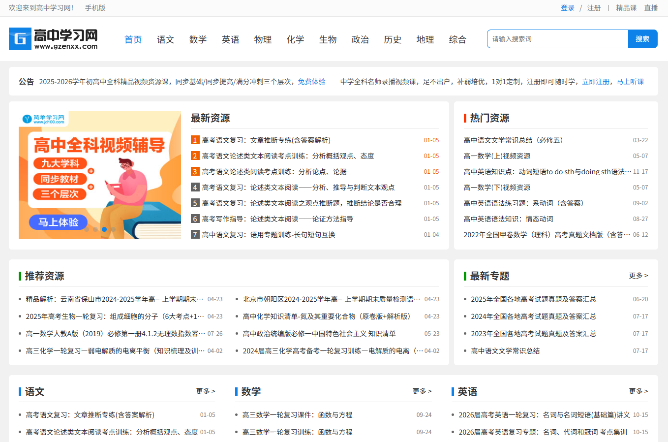 网站的学科资源真的是比较全的了,语文,数学,英语,物理,化学,生物等9大学科的资源都有,比如像高一的同步视频,知识点的复习清单,高山的复习课啊,真题卷啊,甚至还有一些是主题班会课件和心理健康教学设计,相当于是把高中三年所需要的学习资料,教辅素材都给打包好了。