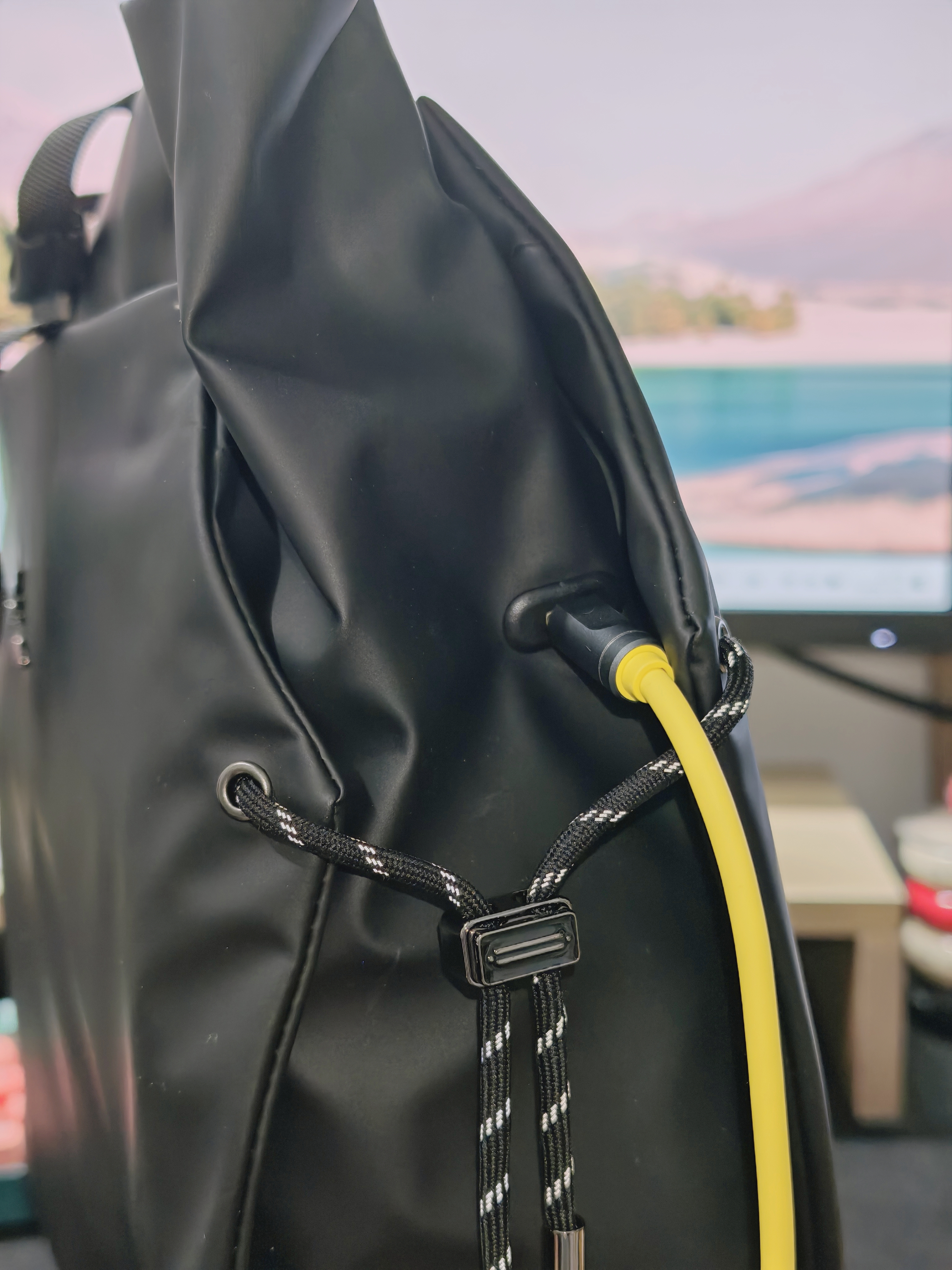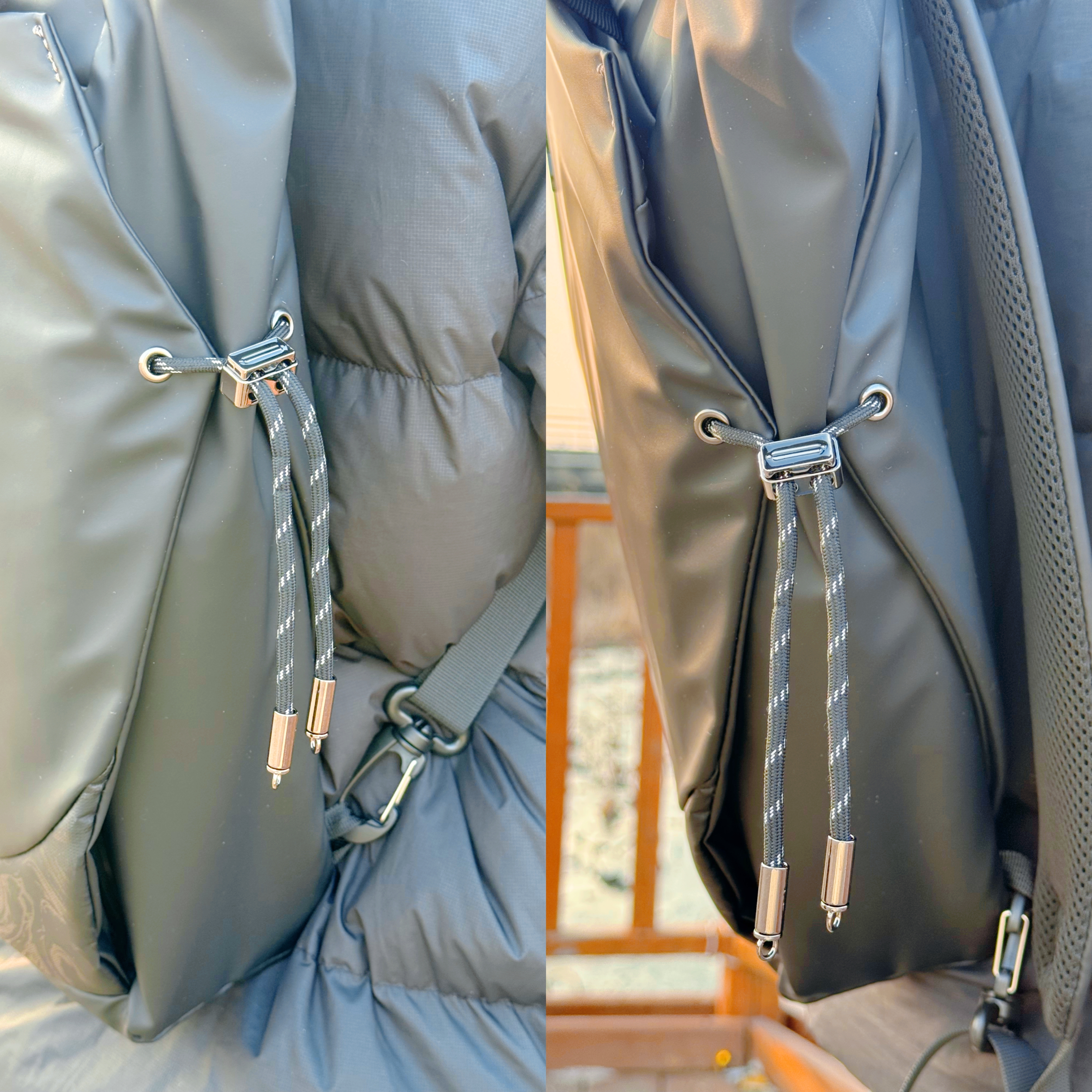 另外,包身两侧的反光绳设计也很贴心,加班晚归的时候,低光环境下能折射光线,让人更容易注意到,安全感拉满。