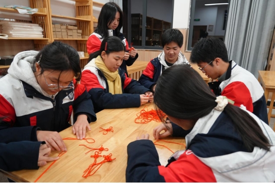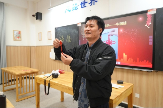 春联征集落幕不久,传统民俗体验活动接力升温。教室里,同学们铺展红纸、挥毫泼墨,笔锋流转间,一个个饱满的“福”字跃然纸上,墨香与年味在校园中交织;手工课上,彩绳翻飞,平结、吉祥结等精美中国结逐渐成型,鲜红绳结串联起平安顺遂的祝愿。学校于海涛老师还从人文地理角度,将理论知识与生活实践相结合,为同学们解读中国结的深层内涵,阐释传统文化与人类探索的紧密关联。指尖实践让传统习俗走出书本,成为可触可感的文化体验,助力学子领悟民俗背后的文化底蕴。