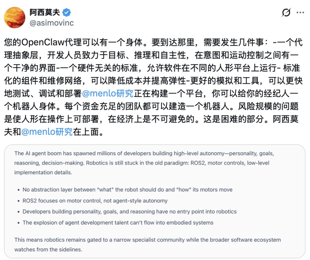 随后,Asimov 账号又直接发帖宣告:“你的 OpenClaw 代理可以拥有实体了。”帖子明确指出:你可以在该平台上为你的 AI 代理赋予机器人身体……Asimov 和 Menlo Research 都将参与其中。这直接将 Asimov 硬件与 OpenClaw 代理生态对接,形成闭环。