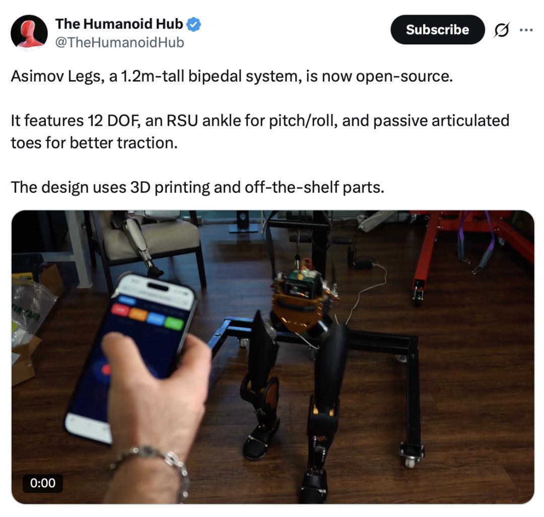 知名机器人专家克里斯·帕克斯顿(Chris Paxton)随即回复:“这看起来太棒了!”同期,Asimov 还开放了腿部参考设计仓库 asimov-v0,并明确表示全身体设计即将跟进。
