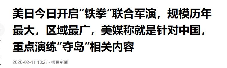 极目新闻2026-02-11——美日今日开启“铁拳”联合军演,规模历年最大,区域最广,美媒称就是针对中国,重点演练“夺岛”相关内容