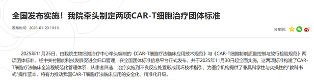 这标志着我国CAR-T细胞治疗领域首次构建了CAR-T细胞治疗“制剂质量-临床应用规范”的完整标准链条,正式迈入标准化、规范化发展的新阶段。