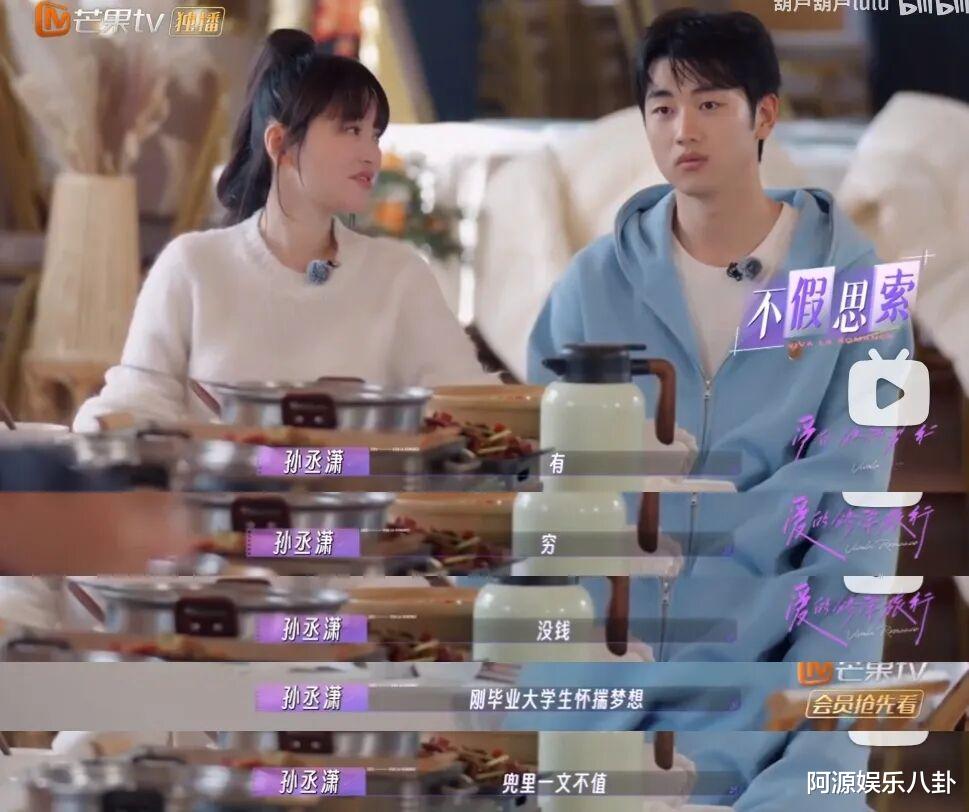 在那档综艺里,孙丞潇不论是资历,资本都远远不如其他嘉宾。但他表现的不卑不亢。朱丹问他和金莎在一起有没有自卑的时候。孙丞潇想都没想就自爆了自己的经济窘境:穷。