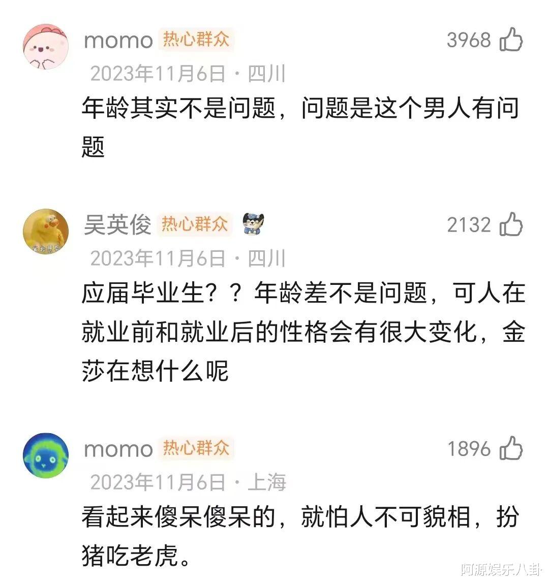 是啊,搁两年前,谁也想不到他俩真的能结婚啊。23年,金莎和孙丞潇参加《爱的修学旅行》公开恋情。两个人的年龄差直接震撼网友。一个是83年,一个是00年。金莎出道那年,她的男友才刚出生!