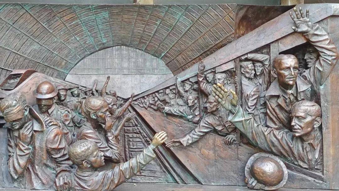 △ 圣潘克拉斯国际车站内一处雕塑壁画,相向而行的两列火车,一边是挥手致意 涌向远方,一边是归途的伤病已经受伤致盲扶着肩膀,独自前行。