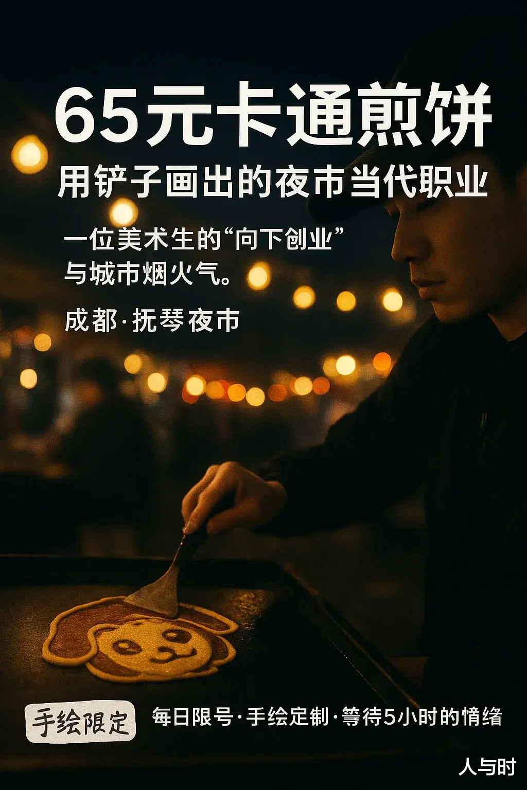 2025年8月,一位"95后"美术生在成都抚琴夜市支起了一个小摊位。三个月后的10月中旬,这个摊位吸引了全国各地的人群。他们甘愿在秋日的夜市排队5小时,只为了买一个卖65元、需要30分钟才能制作完成的煎饼。