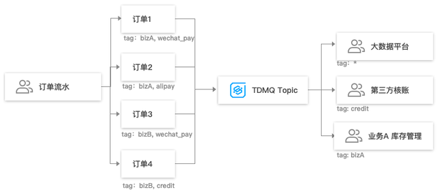 针对上述场景,TDMQ 提供 Broker 端过滤的方式,用户可在生产消息时设置一个或者多个 Tag 标签,消费时指定 Tag 订阅。