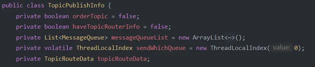 TopicPublishInfo topicPublishInfo = this.topicPublishInfoTable.get(topic);其中路由信息存储在TopicPublishInfo对象里: