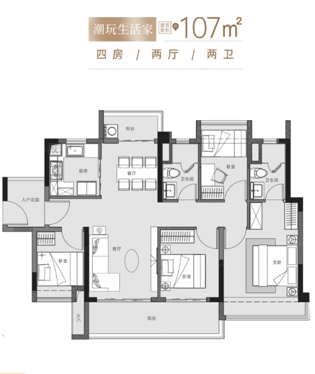 三室两厅一卫(约107㎡):该户型设计合理,客厅与餐厅相连,形成开放式的生活空间,适合家庭聚会和日常生活。主卧配有独立卫生间,增加了私密性。