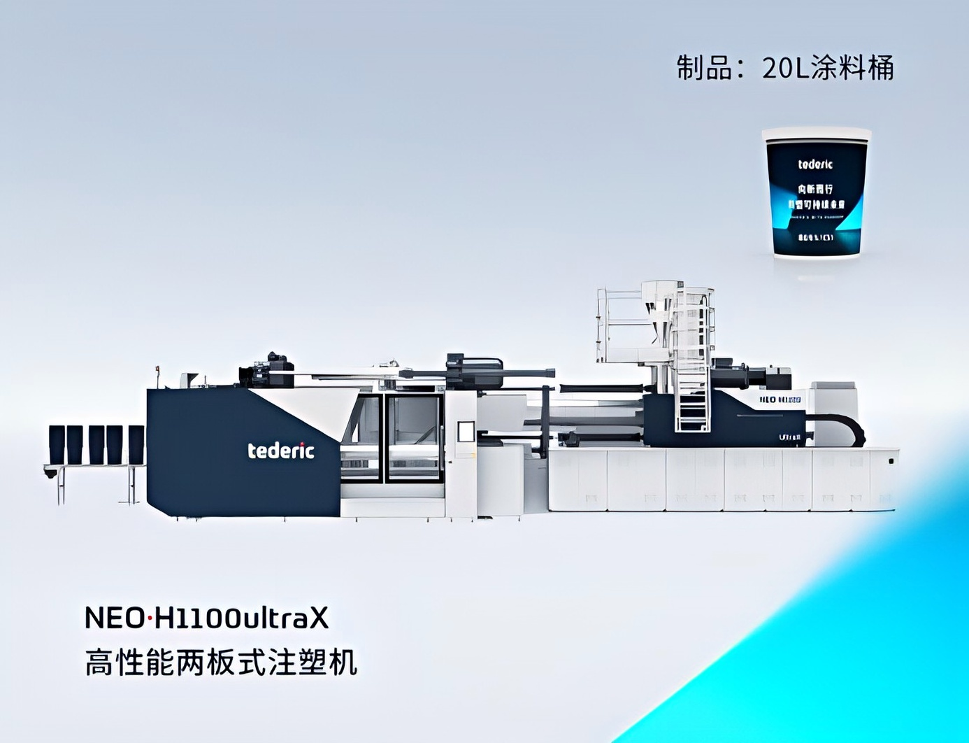 面向物流及大容量包装容器应用,泰瑞推出基于NEO·H1100ultraX 高性能两板式注塑机的高速涂料桶交钥匙生产单元。方案集高速注塑、自动化IML与自动堆叠于一体,具备高度完整的成套交付能力,可实现20L涂料桶1出2的高效循环生产。凭借高自动化、高稳定性与高生产效率,成品可直接满足严苛的跌落与堆叠要求,为大包装制造提供更具竞争力的降本增效方案。