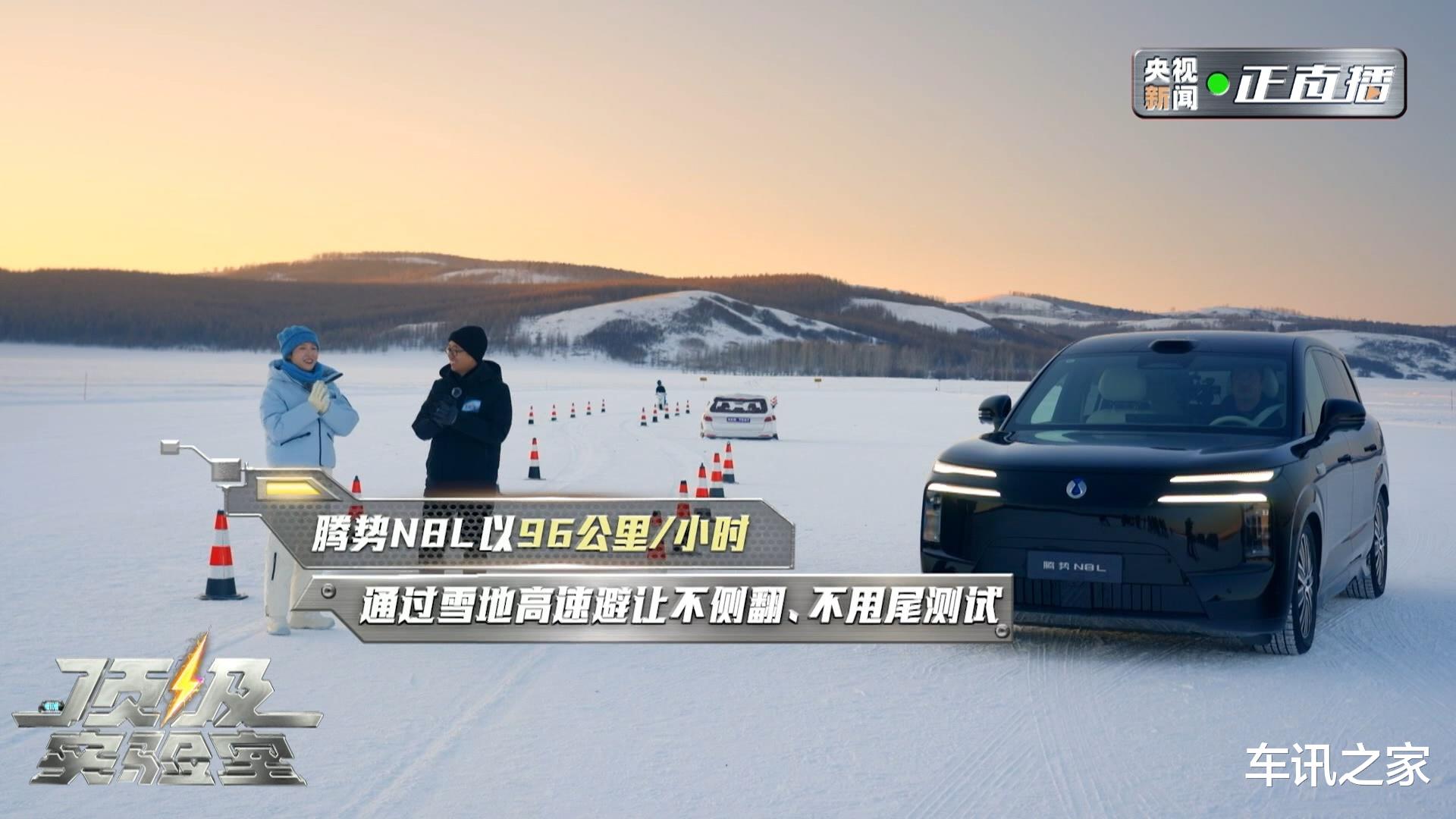 测试中,央视新闻首次开展雪地高速爆胎测试,腾势N8L以142km/h创下全球最高雪地高速爆胎稳定控制速度,结合腾势过往佳绩,构建起全场景高速爆胎不失稳的安全壁垒。此外,腾势N8L、N9在多项极限挑战中展现出超强操控稳定性:96km/h雪地高速避让不侧翻不甩尾、71km/h冰雪湿滑路面极限过弯、87km/h冰雪湿滑路面制动不跑偏,15%坡度三轮在冰面半坡起步、20%冰雪沥青对开坡道上坡、30%雪坡爬坡不溜坡,四层楼深巨型冰锅一把出,双车冰面奶茶塔一杯不洒……央视主持人全程见证,多次惊呼“不可思议”“太神了”“稳稳的安全感”,盛赞腾势测试表现震撼全场。