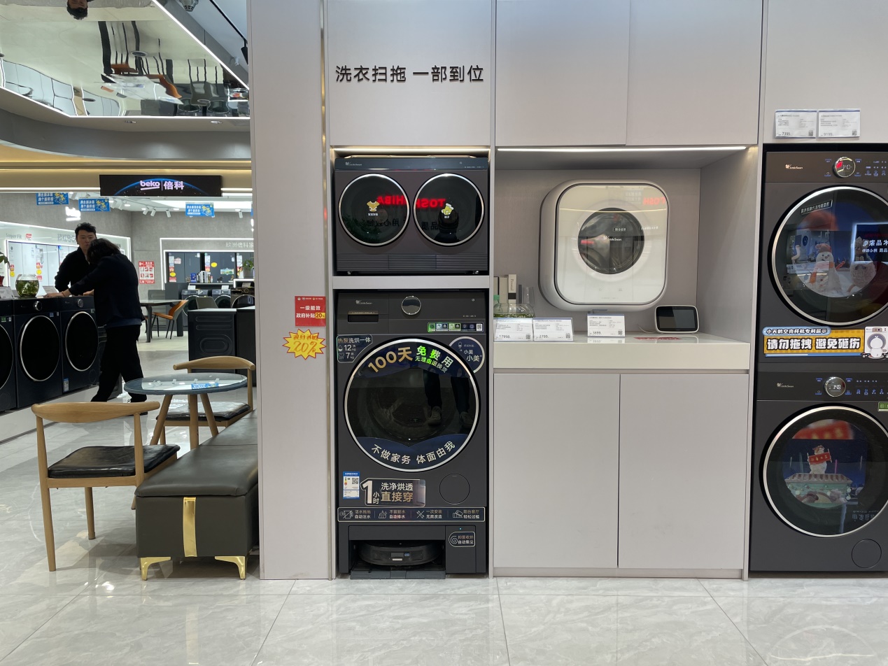 在行业看来,这些形态变化绝非为了标新立异而做的表面文章,而是精准击中了具体的家庭痛点。苏宁易购门店家电管家介绍:同样是大匹数的空调,“悬角式空调”释放了传统柜机占用的地面空间,为客厅省出了0.5-0.8平米的面积,中高位出风则避免了直吹,让室内温度更均匀;集成式的“双洗站MAX”则将洗衣、烘干、扫地、拖地等六大功能垂直整合,一体嵌入柜体,不仅高效利用了阳台空间,也将琐碎的家务动线“隐藏”起来。