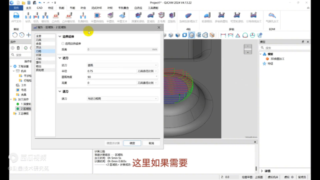 4. 回到参数中,这里如果需要对该平面的边界去进行延伸,可以启用边界延伸策略,并且设置一个距离。同时打算将圆弧的铣刀大小更改为零点五毫米。现在切削刀路是被延伸到了外部。