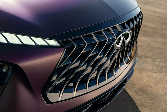 外观方面,英菲尼迪QX65采用全新家族式设计,大尺寸前格栅内部辅以黑色直瀑式中网,中央配备可自发光的英菲尼迪品牌LOGO,搭配星环式点阵LED日间行车灯,很有视觉冲击力。此外,远近光灯则嵌入在两侧导风槽中,强化了整体感。