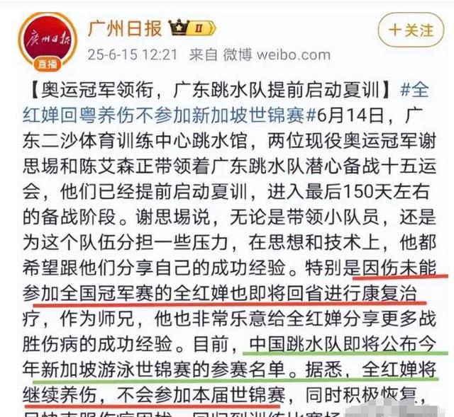全红婵恐将缺席游泳世锦赛,仍在康复治疗中——2025-06-16