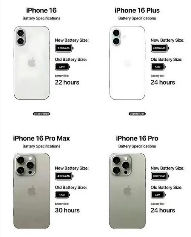 iPhone16系列今年仍然会出4款机型,命名也跟上一年一样。iPhone 16 Pro和Pro Max的显示屏尺寸将分别增加到6.27英寸和6.86英寸,而iPhone 16和Plus型号的显示屏则保持在6.1英寸和6.7英寸。无疑也会把电池容量整加,这两款机型会配备比上一代更大的电池,有更强大的续航能力。